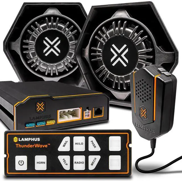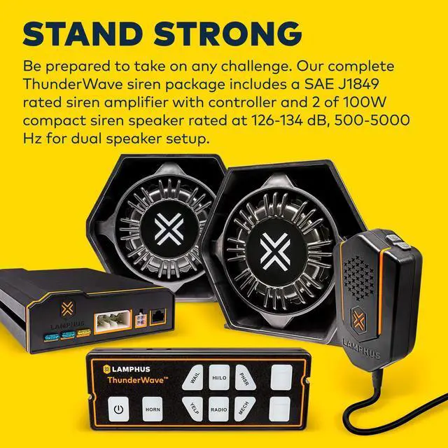 STAND STRONG - Be prepared to take on any challenge. Our complete ThunderWave siren package includes a SAE J1849 rated siren amplifier with controller and 2 of 100W compact siren speaker rated at 126-134 dB, 500-5000 Hz for dual speaker setup. ^^ PERSONALIZED POWER - There's no need to be forced into someone else's preferences. With the option to choose between manual or automatic power-up, and customizable LED backlighting, ThundweWave gives you the power to make your system work for you. ^^ DO MORE - Outfitted with a quick access 3.5 mm audio jack, our controller expands your system beyond basic warning tones and gives the option to patch in audio from your own external source like a cell phone, tablet, bluetooth receiver or more.