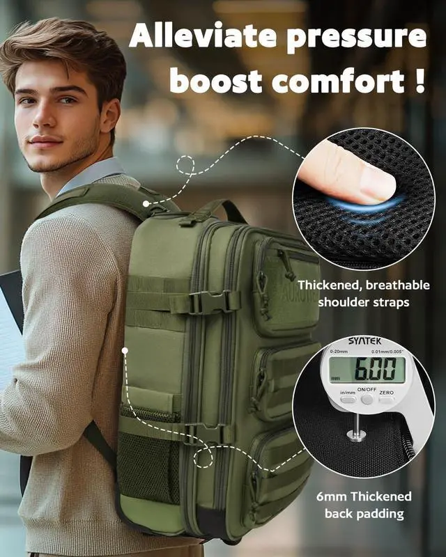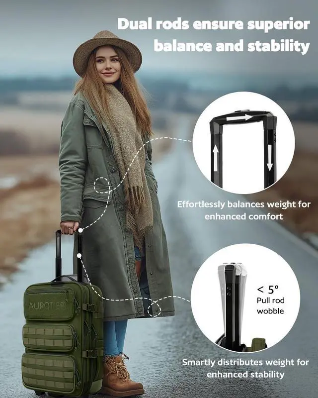 2-in-1, Catering to Your Different NeedsThis rolling backpack easily switches between backpack and rolling modes, offering maximum flexibility to meet different needs. The trolley handle of this rolling laptop backpack has a thickened double-bar design, improving stability and load capacity. The shoulder straps of this rolling outdoor hiking backpack are made of thickened breathable mesh. Combined with the thickened back panel, they distribute weight, reduce pressure, and improve comfort