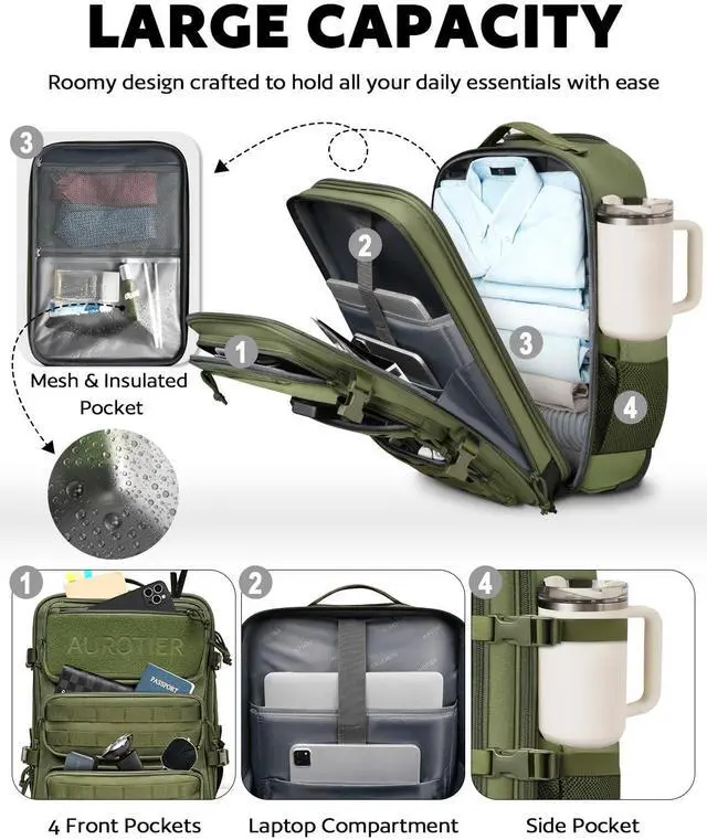 AUROTIER Rolling Tactical Laptop Backpack, 17 Inch Wheeled Military Computer Backpack for Men and Women, Roller Carry on Luggage for Work Travel, Overnight Molle Outdoor Hiking Bag with Wheels, Green