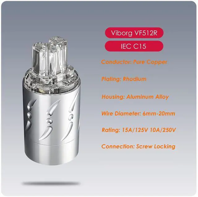 Viborg HiFi Power Plug, VM512R+VF512R, Rhodium-Plated Pure Copper Non-Magnetic, AC Mains Plug, Audio Power Plug, Aluminum, Hi-End US Power Plug+IEC C15 Power Connector for DIY Audiophile Power Cord