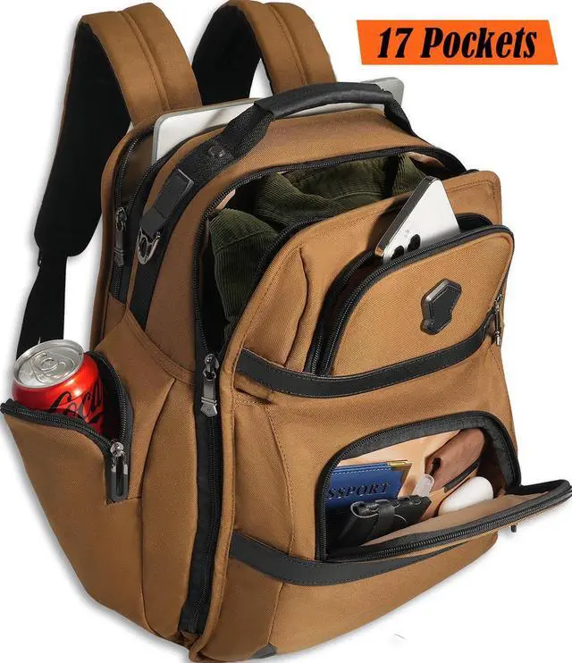 17-Pockets: This work laptop backpack has 17 pockets, a well-padded 16-inch laptop compartment, and separate pockets for various carry-on items, ensuring items are securely organized