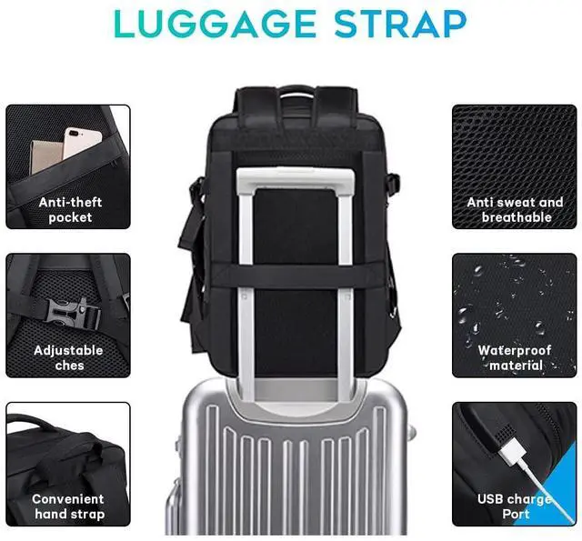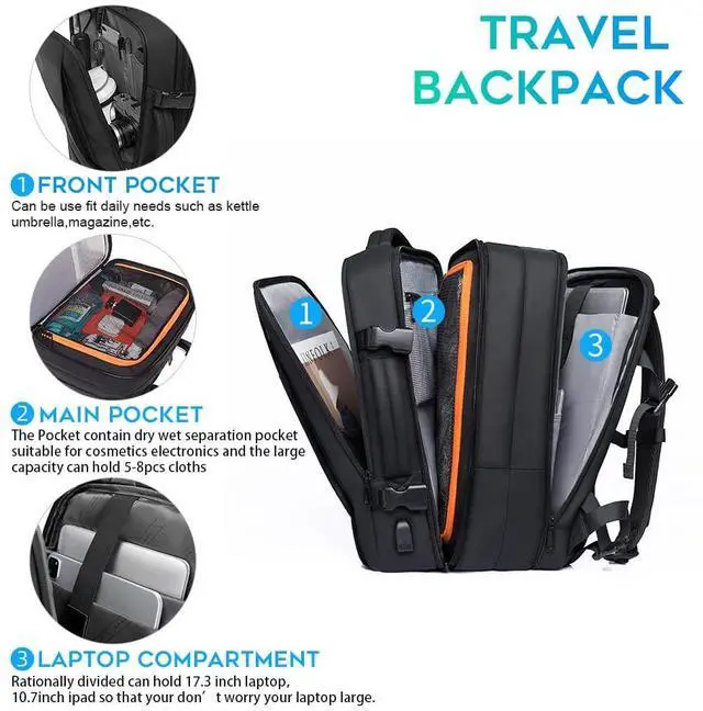 BANGE mens carry on backpack can be expanded from 26L to 45L, and it is perfect for your business travelling, it can hold 7--9clothes in the main compartment, compatible for 17.3 inch laptop, 9.7 inch Ipad. There is one dry and wet separation pocket, and you can separate your wet washing items from others. The two handles set on top and one side, which allow an easy switch between backpack and suitcase. So it can be carried vertically or horizontally. The luggage belt on the back allows being slide over the luggage tube, backpack very easy to carry.