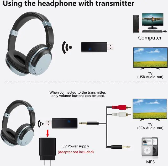 USB Transmitter for TV,3.5mm audio deviceConnect the USB transmitter and source device through the 3.5mm audio cable. The transmitters USB plug is plugged into the 5V power supply, and then the headset is automatically paired. The wireless Headphone function is realized by USB transmitter transmit sound to headphone. Note: This king of connection the sound transmitted is not in stereo.