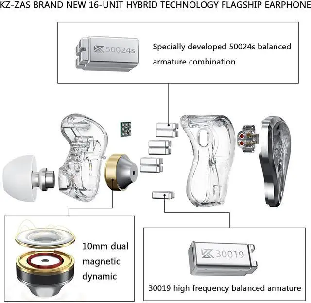 10MM Dynamic Driver + 7 Upgraded Balanced ArmaturesThe 10MM dynamic driver enhances sensitivity at 1KHz, delivering richer musical details. With specially developed components like the 50024s BA and 30019 BA, the KZ ZAS boasts 50024s*6 units for an expansive soundstage and powerful analytical capabilities. The addition of the 30019 balanced armature, combined with the 50024s BA set, fine-tunes transient response, dynamics, and vocals, significantly enhancing high-frequency performance.