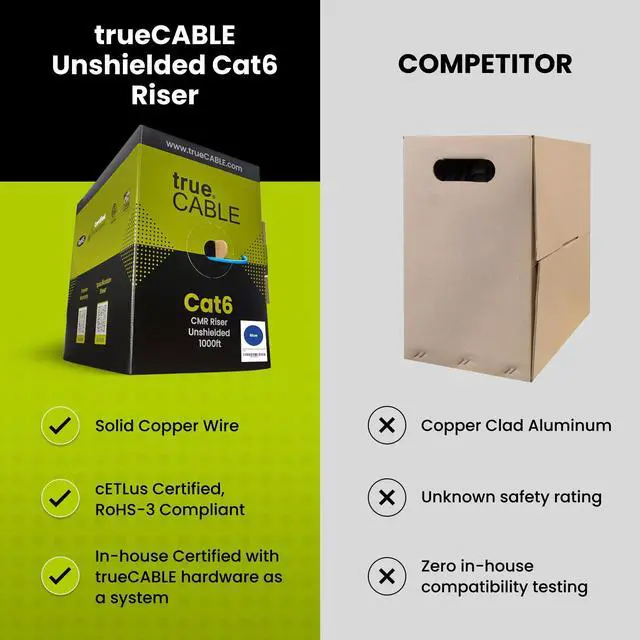 [High Performance Network Cable] This riser rated cat 6 lan cable is 23 AWG with 4 pairs (8 conductors). Suitable for 1 and 5 Gigabit speed up to 328 feet and 10 Gigabit speed up to 165ft depending on the installation environment. Bandwidth tested up to 550 MHz. Supports Power over Ethernet: PoE/PoE+/PoE++ (IEEE 802.3af/at/bt) 4PPoE up to 100W.