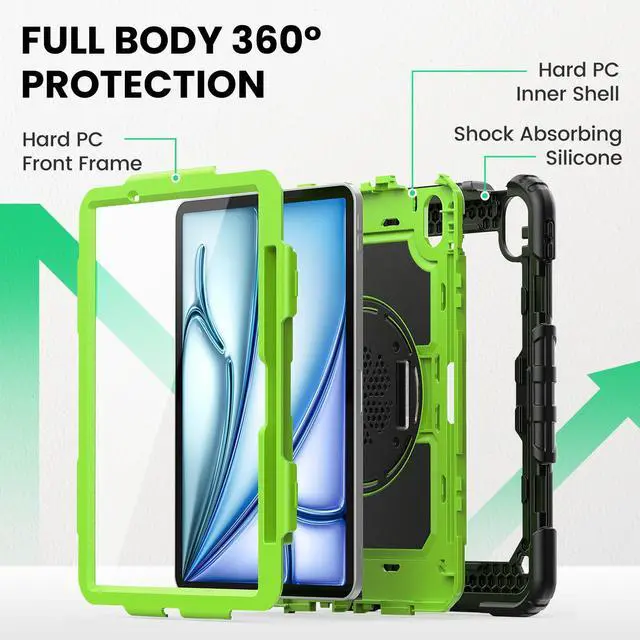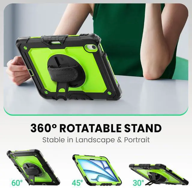 SEYMAC Case for iPad Air 11 Inch M3 2025/M2 2024 (Air 7th/6th Generation), Heavy Duty Shockproof Protective Case with Screen Protector, Rotating Stand and Hand/Shoulder Strap, Green