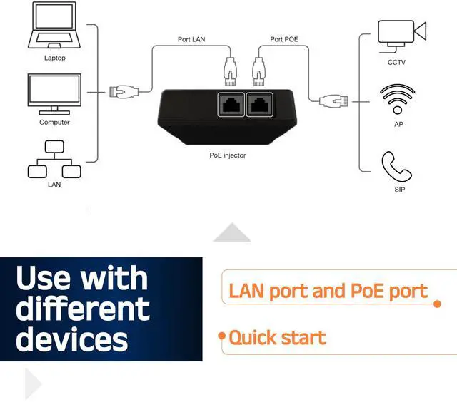 VersatilitySuitable for any PoE powered Ethernet devices due to a special passive algorithm. Power output: 50v DC (25watt). Passive PoE 50 VDC (25 watt). IEEE 802.3 af/at PoE (25 watt). Supported PD in voltage range 36-57 volts. Positive 4,5 pair, negative 7,8 pair. Connect our portable passive PoE injector to a variety of devices including Mobile or Fixed subscriber antennas, Backbone (PtP) antennas, WiFi Access Points, "PoE in" switches, and "PoE" in routers. Ideal for maintaining continuous power supply and operational reliability.