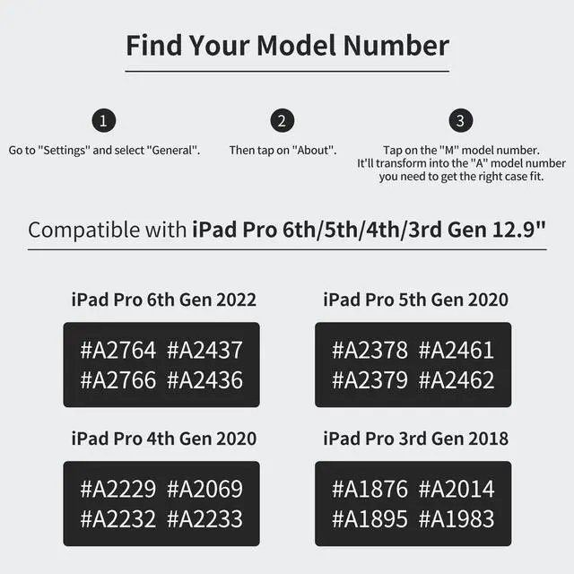 COMPATIBILITY-- Protective stand case only for iPad Pro 12.9 2022 6th generation (A2436/ A2764/ A2437/ A2766), iPad Pro 12.9 Inch 5th Generation 2021 New (A2378/A2461/A2379/A2462)/iPad Pro 12.9 Inch 4th Generation 2020 (Model: A2229 / A2069 / A2232 / A2233 )/ iPad Pro 12.9 Inch 3rd Generation 2018 (Model: A1876 / A2014 / A1895 / A1983). Please check back bottom of your iPad to find the model number