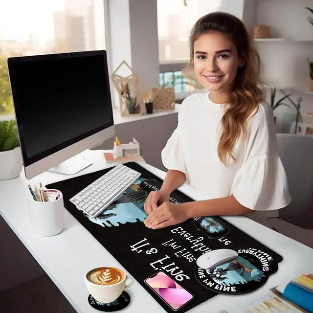 LIMKRIAN Funny Dog Mouse Pad Set Large Desk Mat With Wrist Rest for Gaming, Ergonomic Mousepad, Keyboard Mat, Cup Coaster Set, Office Accessories - It's Fine
