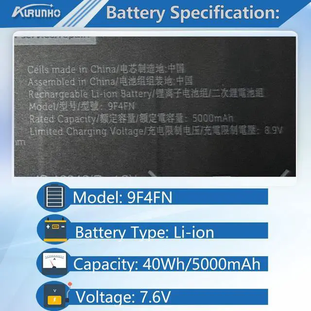 9F4FN Battery Specifications Model: 9F4FN. Voltage: 7.6V . Capacity: 40Wh/5263 . Color: Black . 100% brand New from Manufacturer.