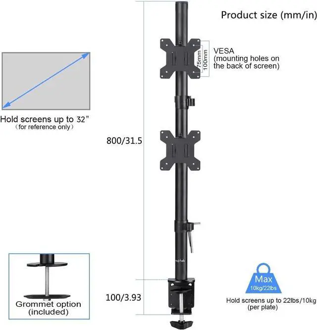 Compatibility - Dual monitor mount ideal for most screens up to 32" and 22lbs each with 75x75mm or 100x100mm backside mounting holes.
