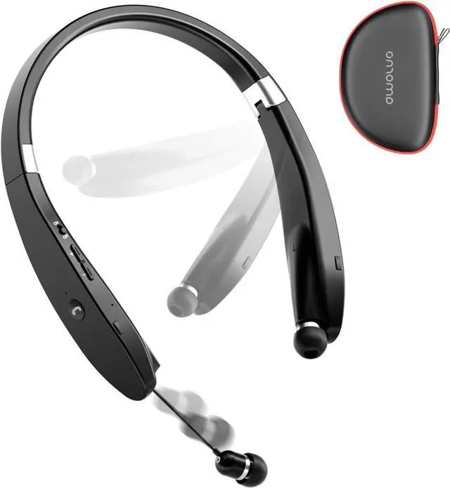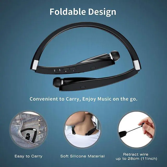 AMORNO Foldable Bluetooth Headphones Wireless Neckband Headset with Retractable Earbuds, Sports Sweatproof Noise Cancelling Stereo Earphones with Mic