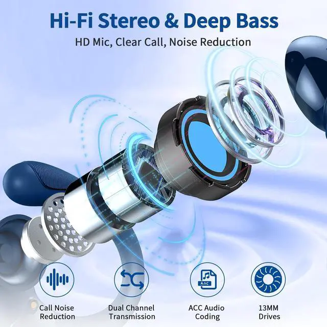 Crystal-clear Call and Hi-Fi Sound Quality: The noise canceling earbuds wireless incorporate 14.2mm double-layer diaphragm drivers, delivering sound with strong bass, clear mids, and bright treble. Benefit from Bluetooth 5.3, the wireless headphones bluetooth establishes a consistent connection to your device within a 30ft range. Besides, the built-in microphones let your voice be transmitted with clarity and precision. Experience hassle free conversations, free from ambient distrac