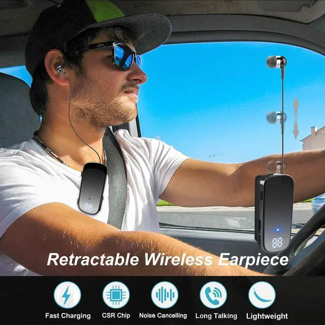 Retractable Wireless Headset, Clip on Retractable Wireless Earbud : Control the cord with button; cable free from tangling, retract it when not in use. Collar clip and flexible pulling design is no kinking and no broken which is in order. It's convenient to clip under your collar and easy to carry, no worry of losing.