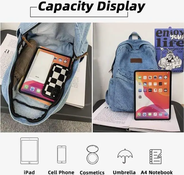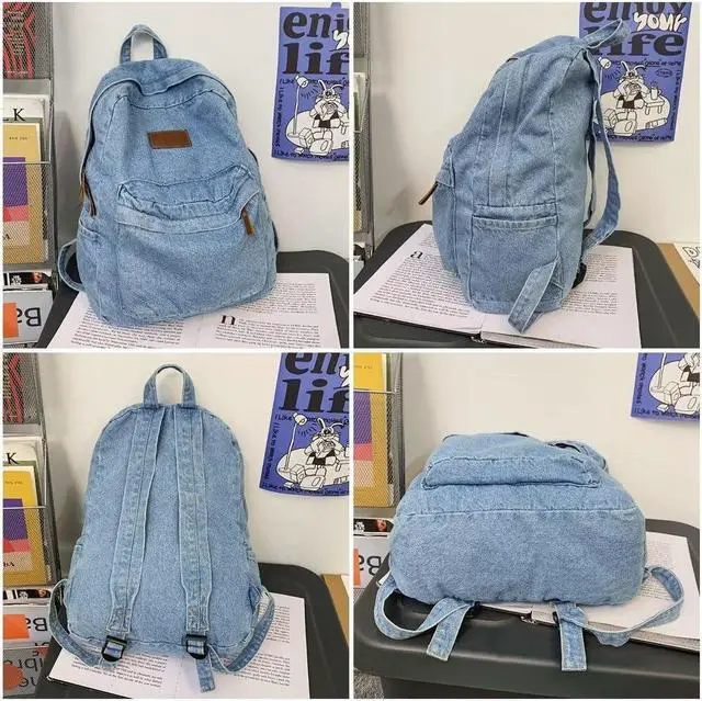1. The fabric of this jeans backpack is soft and comfortable, and the PU leather zipper head is not only chic, but also easy to use. The two-way zipper at the top, the front zipper pocket, the side pockets and the large opening are convenient for accessing items.