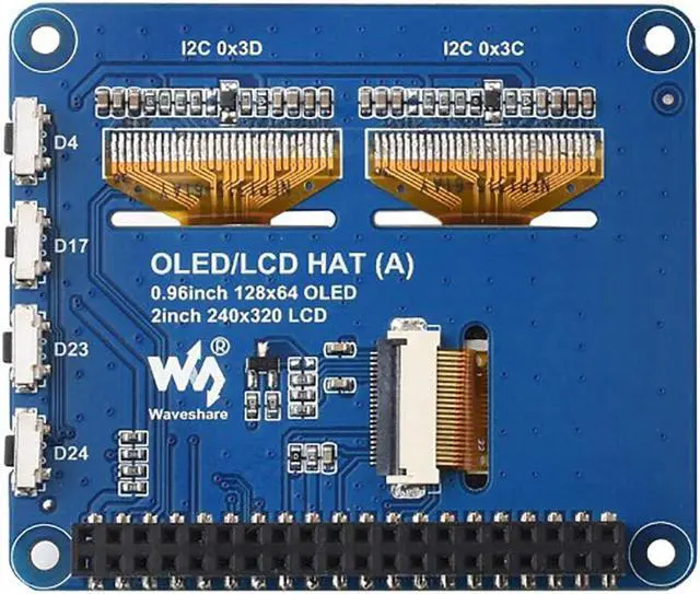 Dual 0.96 inch OLED secondary screens with built in SSD1315 driver chip, I2C interface communication, blue display color, 128×64 resolution, can be used to display key informations, status indicator messages or small graphics