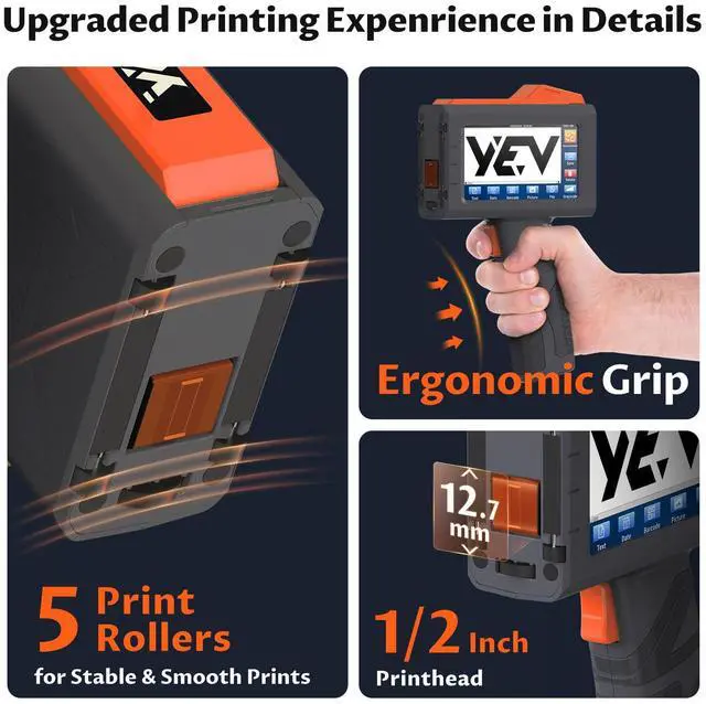 YEV Handheld Inkiet Printer V127 Newly Enhanced 16-Hour Continuous Printing 5 Wheel Support for Printing Batch Numbers, Logos, Serial Numbers, Barcodes, and QR Codes on Diverse Materials (Orange)