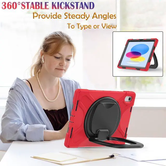 BKOUNCTK for iPad (A16) 11th/10th Generation Case 2025/2022 (11/ 10.9 ), Heavy Sturdy Shockproof Kids Case with Screen Protector, Rotating Stand/Pencil Holder/Shoulder Strap - (Red)