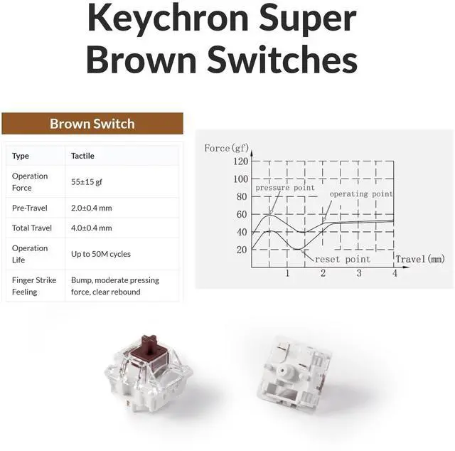 Keychron Super Brown Switch: Experience balanced feedback with the Super Brown Switch. Its tactile bump at the actuation point makes it ideal for both typing and