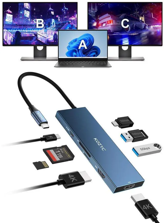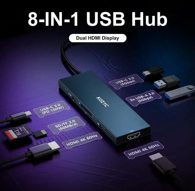 8 IN 1 USB-C HubThe KOZYC USB-C hub with 2x HDMI 4k@60Hz, 2x USB 3.0, 1x USB-C (USB 3.0 data), 1x TF (Micro-SD), 1x SD, and 1x 100W PD charging port. Designed to expand Type-C port devices for more connectivity options. USB 3.0 up to 5Gbps, 5V 0.9A, TF/SD 2.0 up to 60MB/s, and PD charging up to 100W. Note: Power output may be less than 100W due to cable loss, fluctuations and pre-deducted power. E.g., 100W input, 85W output