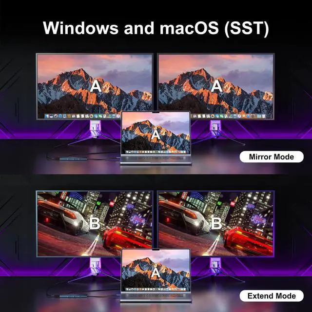USB C Hub with 2 HDMIPlug and play, no driver download. This USB-C to Dual HDMI adapter supports SST mode on Windows & macOS. MST mode only on Windows. macOS support: AAA, ABB mode (Not support MST ABC mode). Windows support: AAA, ABB, AAB, ABC mode