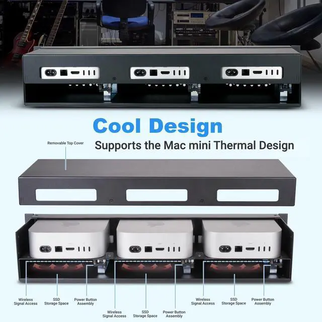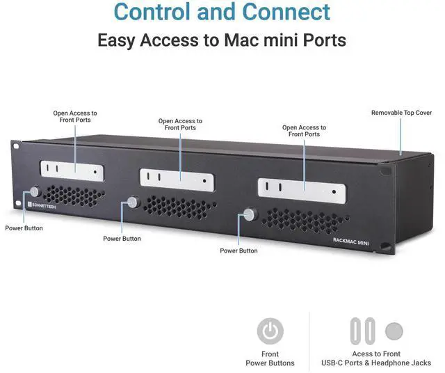 Cooling Airflow Management: Supports front to back airflow through each Mac mini to keep them operating as cool in a rack as on the desk, even when the enclosure is mounted between two other rack mounted components.