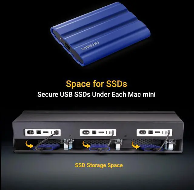 Ideal for Use in Server Rooms with Space for Storage: 2U height and standard mounting holes enable easy installation into any standard server rack. Beneath each Mac mini is a space to place a USB SSD (sold separately).