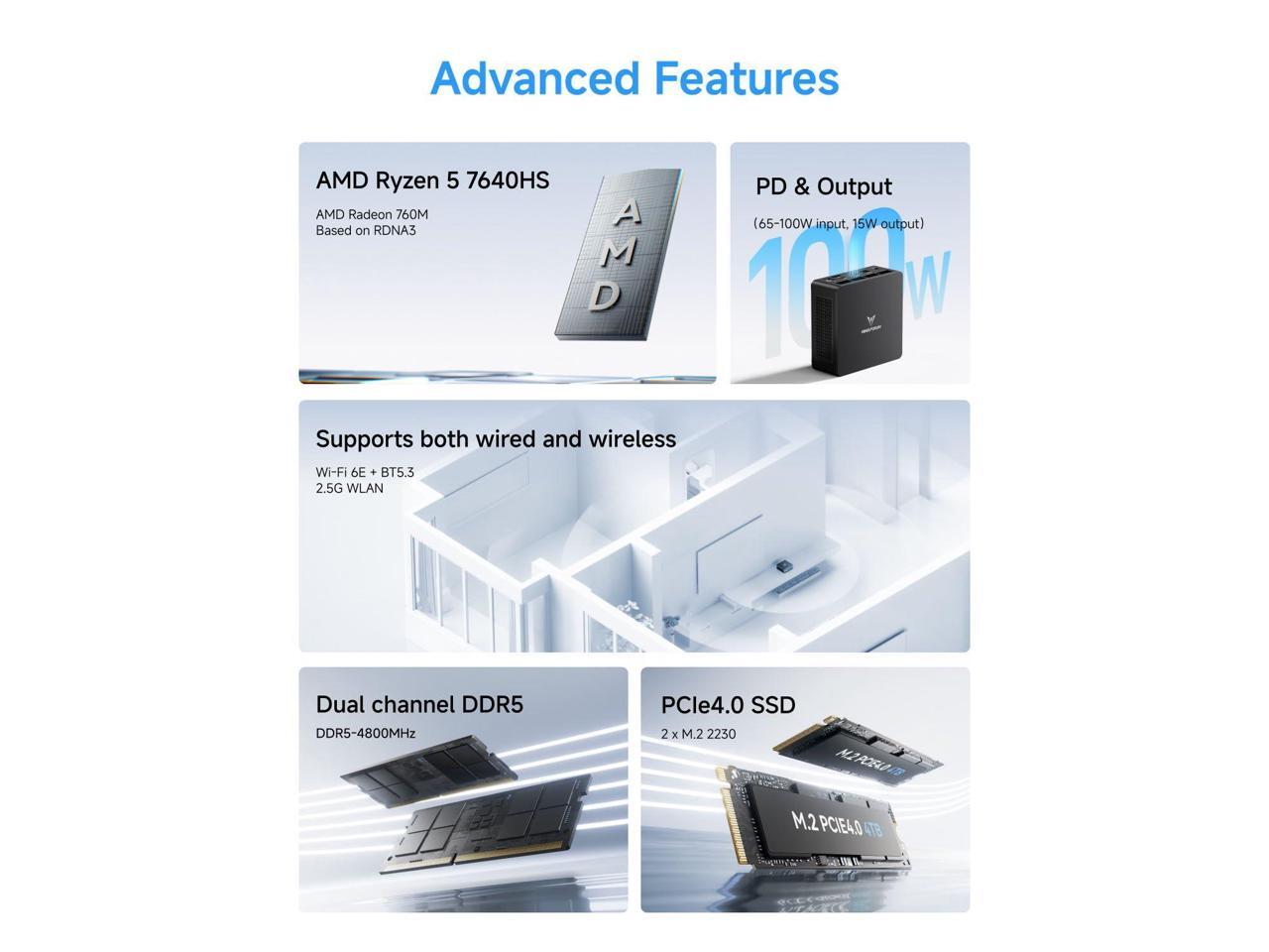 - Triple Display Output: this Mini PC comes with Integrated AMD Radeon 760M Graphics Graphics(graphics frequency 2600 MHz), 8K@60Hz display output via HDMI 2.1 and USB4 Port, 4K@60Hz display via DisplayPort, you could connect three independent displays, which ensures smooth navigation, responsive work processes and comfortable handling of apps and files and expands multiple work-spaces for more efficient and comfortable productivity.