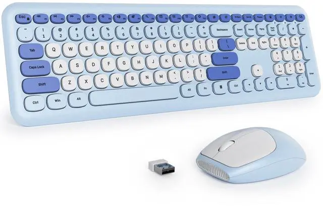Fogruaden Quiet Wireless Keyboard and Mouse Combo, 2.4GH z Retro Cute Typewriter Full-Size Colorful Blue Keyboard, Slim Design, Low-Noise Typing for Home, Office, Windows PC, Laptop