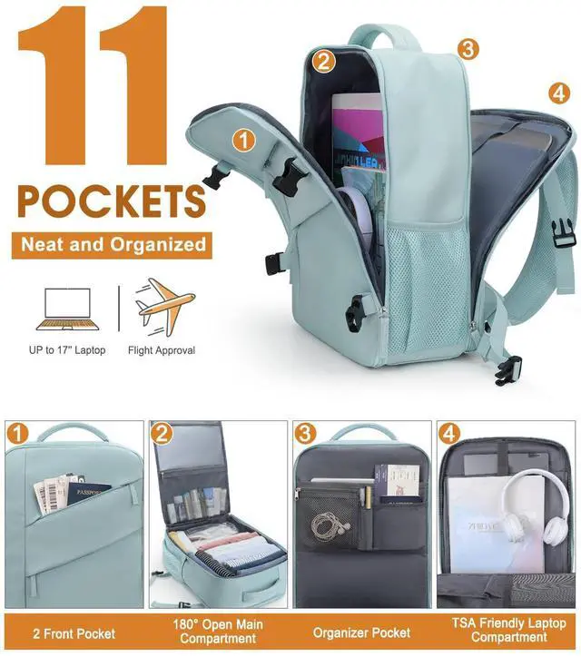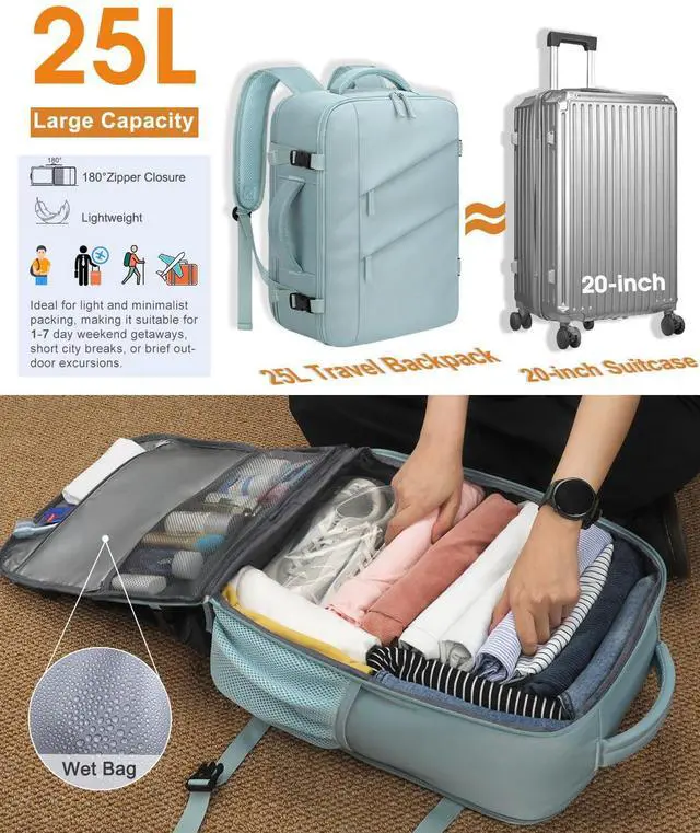 25L Capacity & 11 Pockets to Keep Organized:Roomy main compartments with 180° opening zipper allow access from the top like a traditional backpack or fully open like a suitcase. Say goodbye to mess and now every item has its place.2 front pockets for easy access to travel essentials, while a dedicated wet/dry bag separates toiletries. 1 zipper mesh pocket provides visual storage, Padded laptop compartment with 1 organizer pocket is nice for small items, keeping everything neat and within reach.