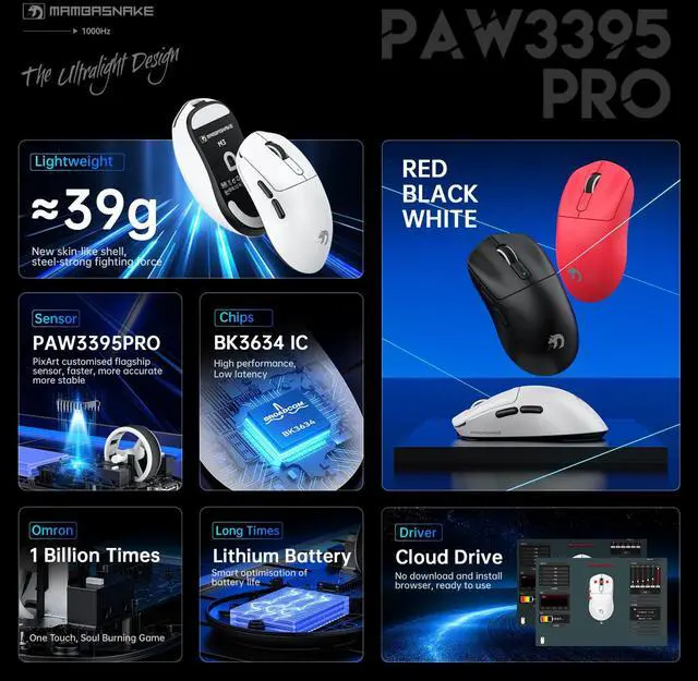 MAMBASNAKE M3 Wireless Gaming Mouse,39g Ultra-Lightweight BT/2.4GWireless/Wired Gaming Mouse,PAW3395PRO 40K DPI Optical Sensor,200Hrs Battery,Tape,Office Mice for PC/Win/Mac (Black)