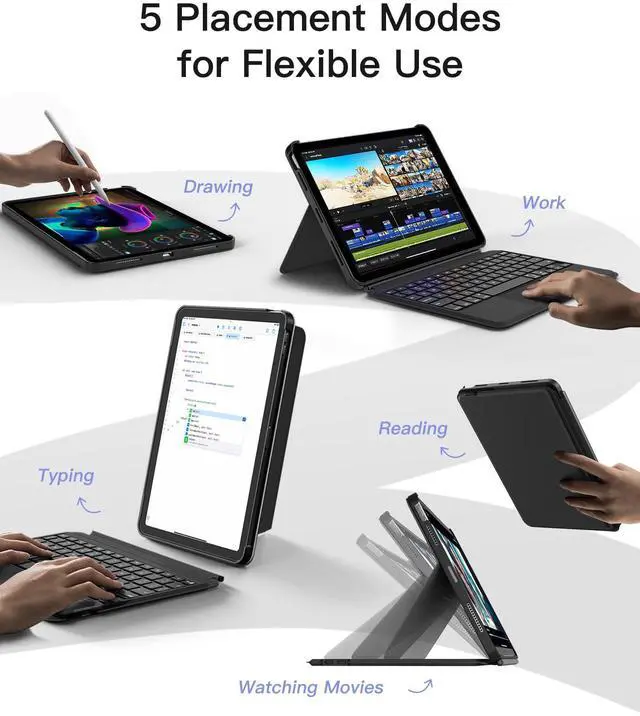 Compatibility: The iPad case with keyboard specially designed for iPad Air 4/5/6 (10.9 inch) and iPad Pro 11 inch 1/2/3/4. iPad Pro 11 4 Gen 2022 (A2435/A2759/A2761/A2762),iPad Air 6th Gen 2024(A2902,A2903,A2904), iPad Air 5 Gen 2022 (A2591/A2589/A2588), Air 4. Generation 2020 (A2325/A2324/A2316/A2072), iPad Pro 11 3rd Gen 2021(A2301/A2377/A2459/A2460), iPad Pro 11 2nd Gen 2020 (A2228/A2068/A2230/A2231), iPad Pro 11 1st 2018 Gen (A1980/A2013/A1934/A1979)
