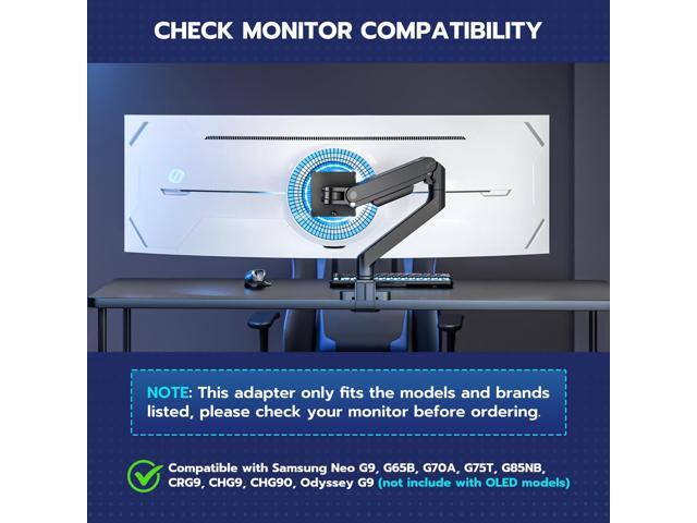 - Quick Adapter Solution for Samsung MonitorsARES WING monitor arm & VESA adapter bundle is tailored specifically for Samsung monitor models include: Neo G9, G65B, G70A, G75T, G85NB, CRG9, CHG9, CHG90, and Odyssey G9 (Incompatible with OLED models). Before making your purchase, please double-check that your monitor model is compatible with this adapter.