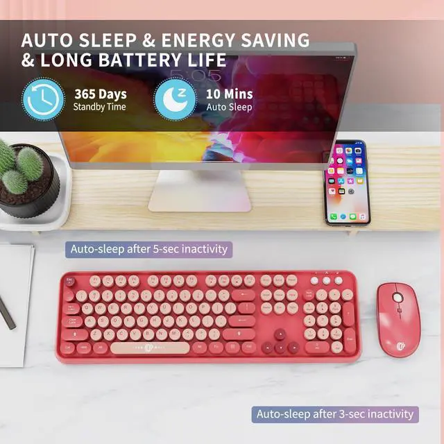 Wireless Keyboard and Mouse Combo, 104 Round Keys Cute Colorful Keyboard and Mouse with Retro Typewriter for PC/Mac/Laptop/Tablet/Computer/Windows Rose