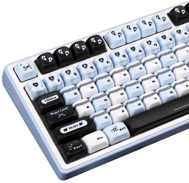 This 145-key keycap set is compatible with multiple mechanical keyboard layouts including 61/64/68/75/84/87/96/98/104/108 ANSI ISO layouts, with both 6.25U and 7U spacebar options. The FOA profile keycaps feature rounded edges similar to MOA-profile keycaps, with an ergonomic stepped layout for comfortable typing. Made from high-quality PBT material with a matte finish, these keycaps are durable and pleasant to touch. The five-sided dye sublimation process ensures long-lasting, clear patterns and characters. The blue and black color scheme offers stylish customization options for your mechanical keyboard.