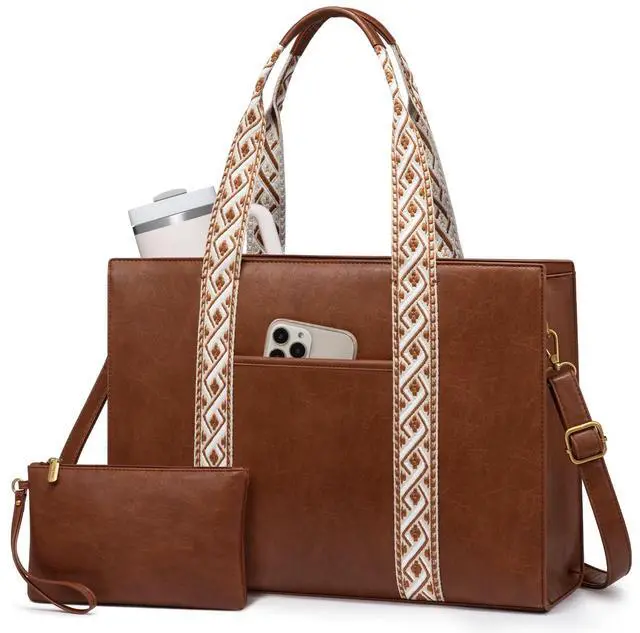 Perfect Size Women's Briefcase: Measuring 16.4" L x 5.9" W x 12.3" H and weighing just 2.67 lbs, this women's computer tote bag combines style and utility. It features adjustable shoulder straps and a secure top zipper. Included is a 8.7" L x 7.3" H pouch for coins, cosmetics, passports, and phones. Versatile in function, it serves as a ladies' briefcase, teacher tote bag, computer bag, or crossbody work bag.