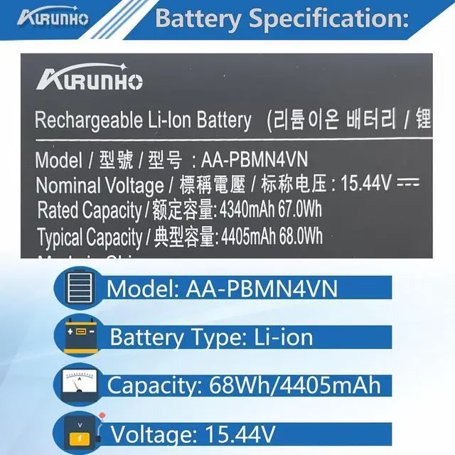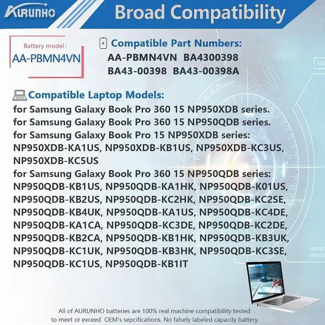 AA-PBMN4VN 68Wh Laptop Battery Replacement for Samsung Galaxy Book Pro 360 15 15.6NP 950XDB NP950XDB-KA1US NP950XDB-KB1US NP950XDB-KC5US NP950XDB-KC3US NP950QDB NP950QDB-KB1US NP950QED NP950QED-KB1US