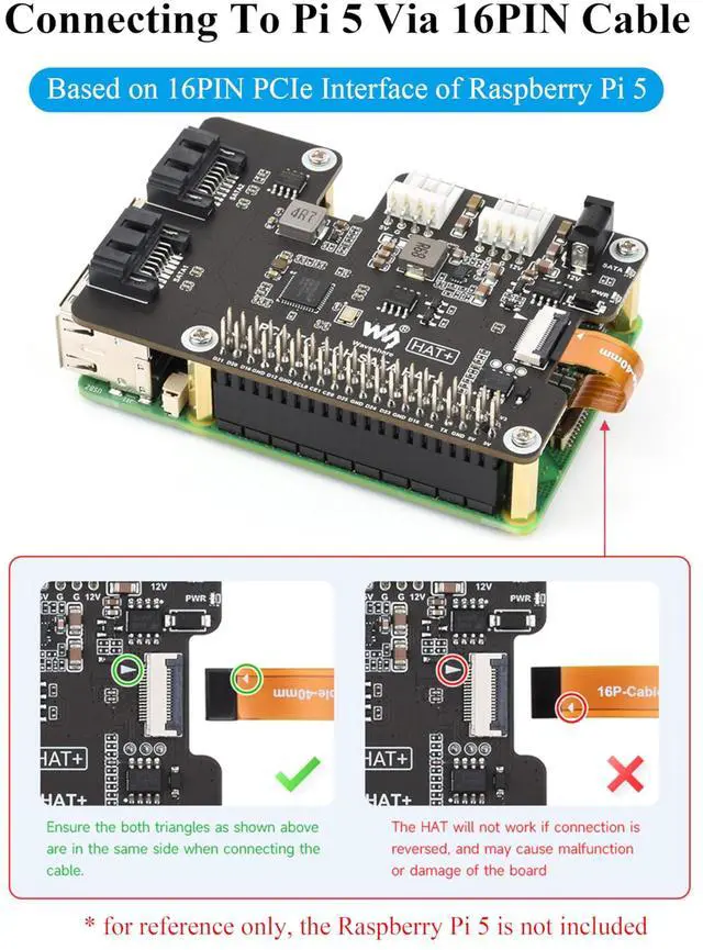 • PCIe TO 2-CH SATA HAT+, Compatible with Raspberry Pi 5, driver-free, plug and play.