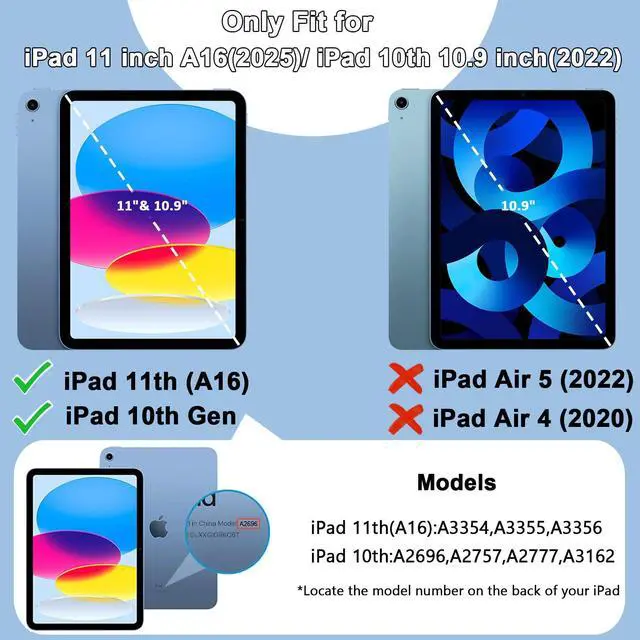 Model Specification Designed for iPad (A16) 11th generation 11 inch/ 10th generation 10.9 inch (Model includes: A3354/A3355/A3356/A2696/A2757/A2777/A3162) 2025/2022 released. Please check back bottom of your iPad to find the model number. NOTE: This case does NOT include a built-in screen protector.