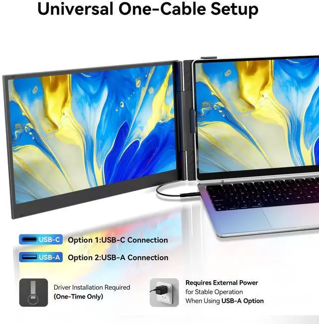 - : The triple-screen monitor has a built-in graphics card, and with the creative Silicon Motion SM76x series drivers, you can connect your laptop with two external displays using just one USB-C cable, thats something most competitors can't do. Please download the driver to the laptop first using the USB flash drive in the package, and then connect the triple laptop screen extender with the cable (User Guide for your reference). Its the ultimate plug-and-play simplicity for the modern professional on the go