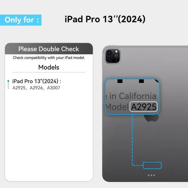 Compatibility: only for iPad Pro 13 inch (2024, M4); Model:A2925,A2926,A3007, Please check your iPad model number on the back of your device (starting with "A") before purchasing to ensure compatibility.