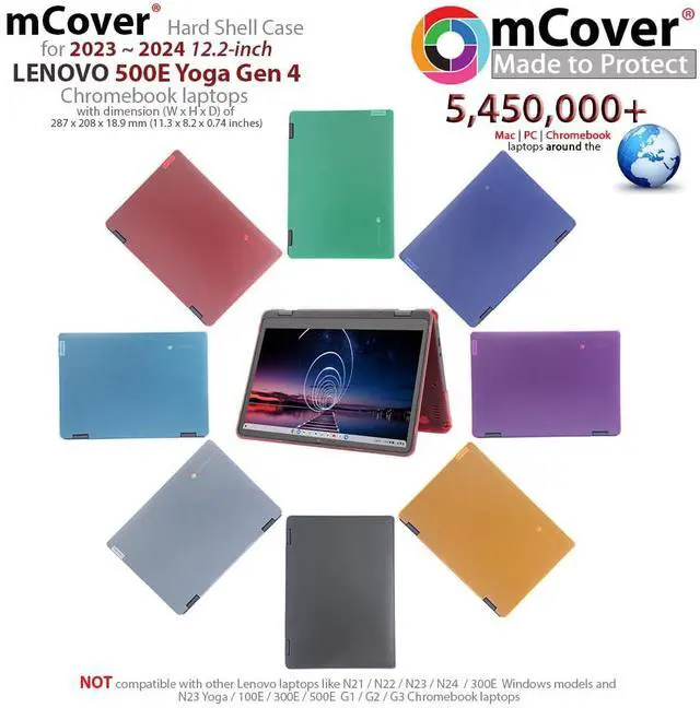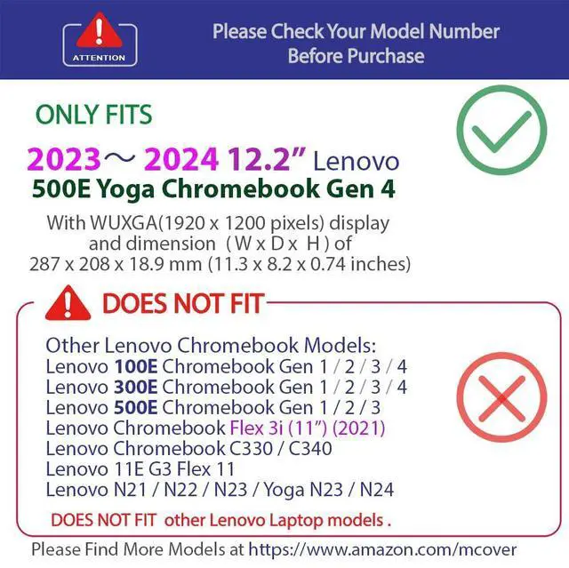 Designed to perfectly fit the 2023~2024 12.2" Lenovo 500E Yoga ( with 360-degree hinge ) Chromebook Gen 4 Laptop with dimension of 287 x 208 x 18.9 mm (11.3 x 8.2 x 0.74 inches)