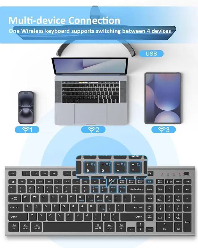Multi-Device & System: Tired of juggling multiple keyboards for different devices? Our keyboard breaks the barrier! You can connect 4 devices with just one keyboard. After connecting to the corresponding device for the first time. You can easily switch between devices by simply using the Fn key combination. Compatible with Android/iOS/macOS/Windows systems (Some Android versions may have some incompatible multimedia keys). The keyboard can be connected in a variety of ways via BT 3.0, BT 5.0, and 2.4GHz receiver (includes a USB to Type C adapter).