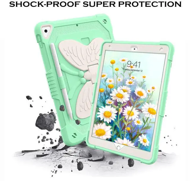 YINLAI for iPad 9th Generation Case, iPad 8th 7th Generation Case, iPad 10.2 Inch Case 2021/2020/2019 with Pencil Holder Butterfly Kickstand Girls Kids Heavy Duty Shockproof Protective Cover, Green