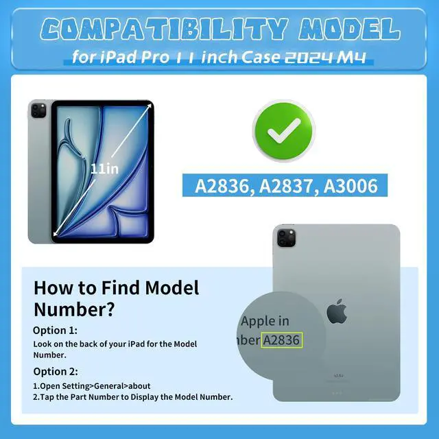 E-puhate for the iPad Pro case 11 inch is compatible with the iPad Pro 11-inch (M4, Released in 2024), fits models: A2836, A2837, and A3006.