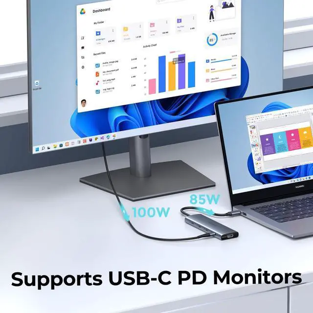 Optimized for USB-C PD Monitors Directly powers and drives premium USB-C PD monitors (e.g., Dell Ultrasharp U2720Q, BenQ PD3220U) via the fully functional USB-C port (4K@60Hz + 100W PD) no separate power cable required. Mix with HDMI displays for hybrid setups (USB-C + HDMI)