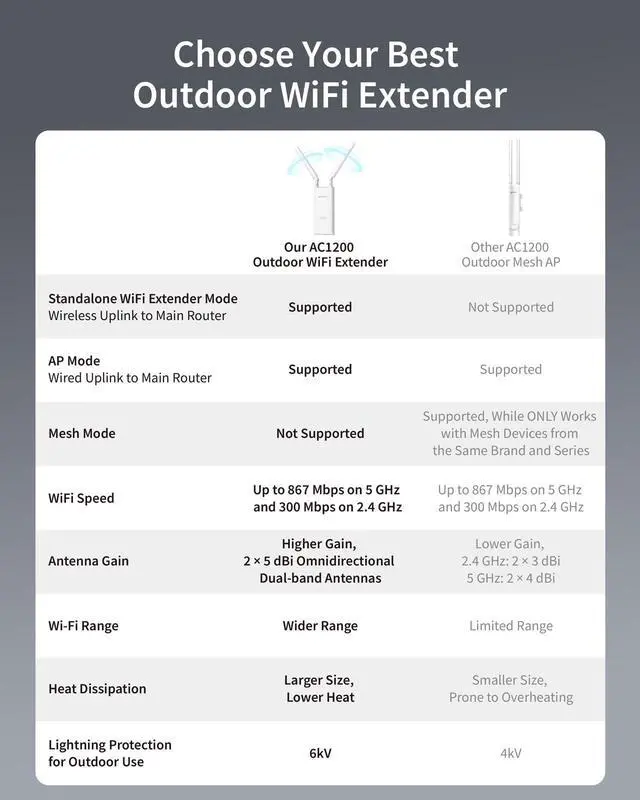 Reliable Outdoor WiFi: Stay connected, rain or shine! The outdoor WiFi extender delivers stable performance even in challenging weather conditions, featuring an IP65-rated waterproof and dustproof housing, 6kV lightning protection and 8kV ESD protection