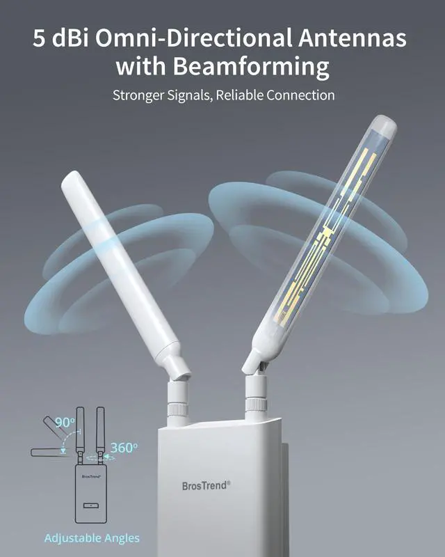Enhanced Signal Coverage: Equipped with two adjustable 5dBi omni-directional antennas, the outdoor WiFi repeater ensures broader coverage in all directions. Combined with Beamforming technology, it focuses signals directly toward your devicesdelivering stronger connection