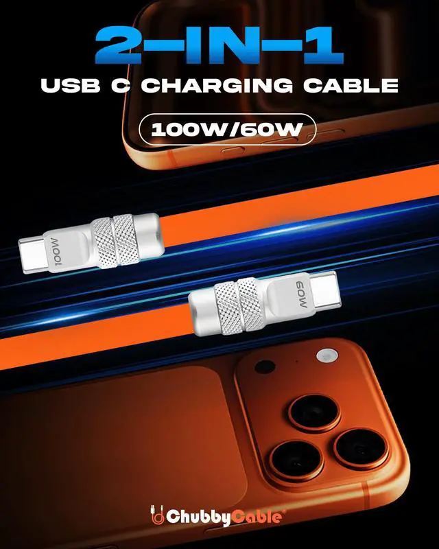 chubbycable Duo-Flex 100W & 60W 2-in-1 Fast Charging & Data Transfer Cable with Soft Silicone USB C Multi Charging Cable for iPhone 17 Series iPad Galaxy Series, Orange