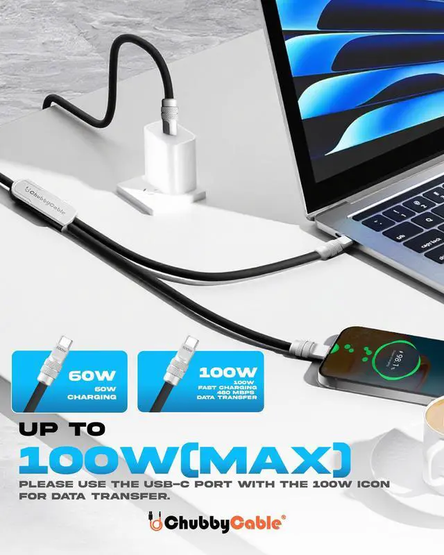 2-in-1 USB-C Charging Cable: With its dual-connector design, you no longer need multiple cables for different devices; ChubbyCables 2-in-1 USB-C cable lets you charge two devices at once, perfect for business trips, vacations, or anyone carrying a smartphone, tablet, or even the new iPhone 17 Series